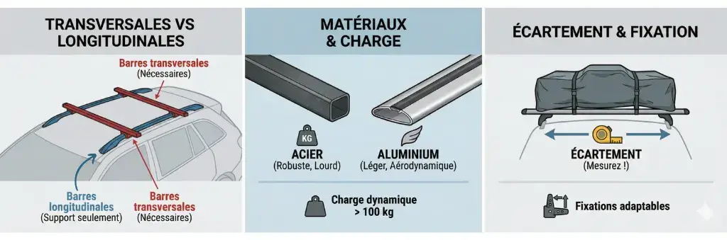 Les barres longitudinales (qui longent le toit d’avant en arrière) ne suffisent jamais seules. Elles servent uniquement de support pour fixer les barres transversales. Si votre voiture n’a que des barres longitudinales, il faudra acheter des transversales compatibles. Si elle n’a rien du tout, des kits universels existent avec des fixations qui se clipsent directement sur les rails ou points d’ancrage intégrés au toit.
