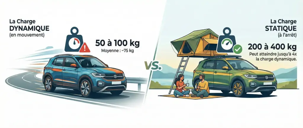 La charge dynamique correspond au poids maximal que votre toit peut supporter pendant que vous roulez. Cette limite est généralement fixée entre 50 et 100 kg selon les modèles de véhicules (75 kg étant la moyenne). Pourquoi si bas ? Parce que le constructeur calcule la stabilité du véhicule dans les virages, les freinages d’urgence, et les manœuvres brusques. Un poids élevé en hauteur déplace le centre de gravité et augmente les risques de basculement. C’est donc une limite de sécurité routière, pas de solidité structurelle du toit.