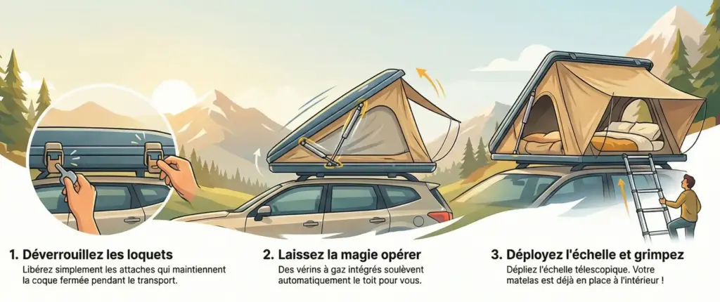 La tente de toit rigide ressemble à un gros coffre de toit sportif quand elle est fermée. Sous cette coque en ABS ou en fibre de verre se cache un système ingénieux : des vérins à gaz qui propulsent littéralement le toit vers le haut dès que vous déverrouillez les loquets. En 30 secondes chrono, vous passez d’un coffre aérodynamique à une chambre sous le ciel. L’échelle télescopique se déplie, le matelas est déjà en place, les fenêtres moustiquaires intégrées vous protègent. C’est le summum de la praticité.