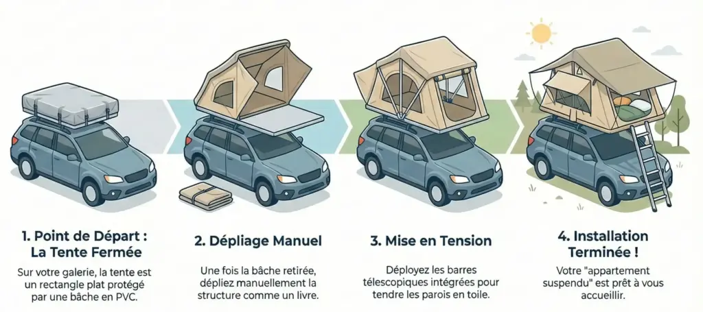 La tente souple se replie comme un livre ou un accordéon sur votre galerie. Fermée, elle forme un rectangle plat de 15 à 25 cm d’épaisseur, enveloppé dans une bâche en PVC étanche. Une fois sur place, vous dépliez manuellement cette structure grâce à des barres télescopiques intégrées. Les parois en toile ripstop se tendent, révélant un véritable appartement suspendu.